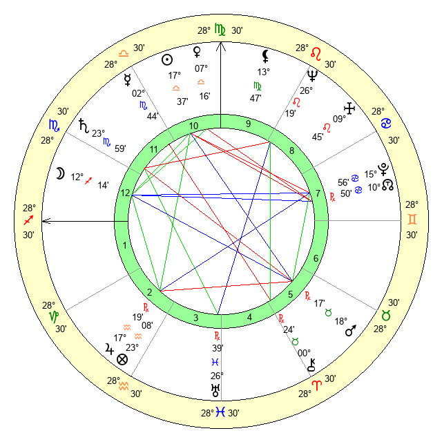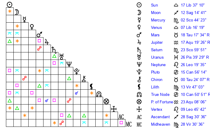 | Moon | 12 Sagittarius 18 | 21 Gemini 40 | 6 Leo 23 |