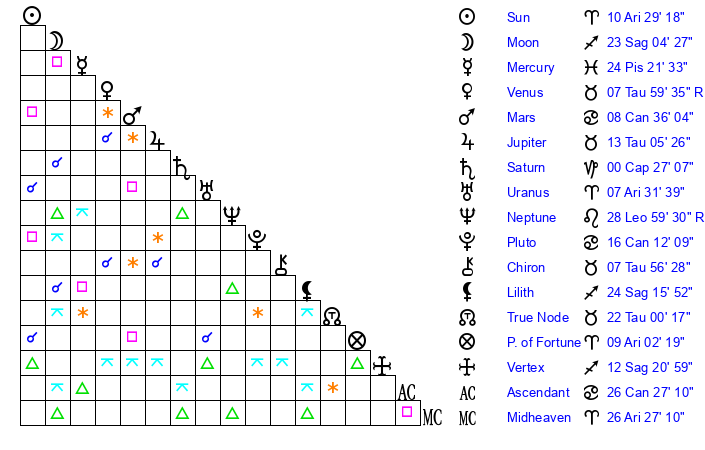 | Moon | 22 Sagittarius 55 | 12 Taurus 59 | 26 Gemini 39 |