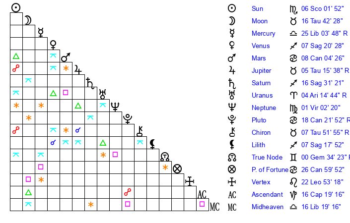 | Moon | 16 Taurus 30 | 6 Aquarius 51 | 7 Sagittarius 18 |