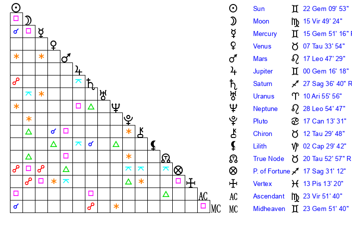 | Sun | 22 Gemini 10 | 22 Gemini 56 | 24 Virgo 18 |