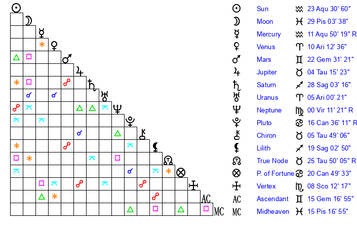 | Mercury | 11 Aquarius 50 | 26 Aquarius 44 | 19 Gemini 30 |