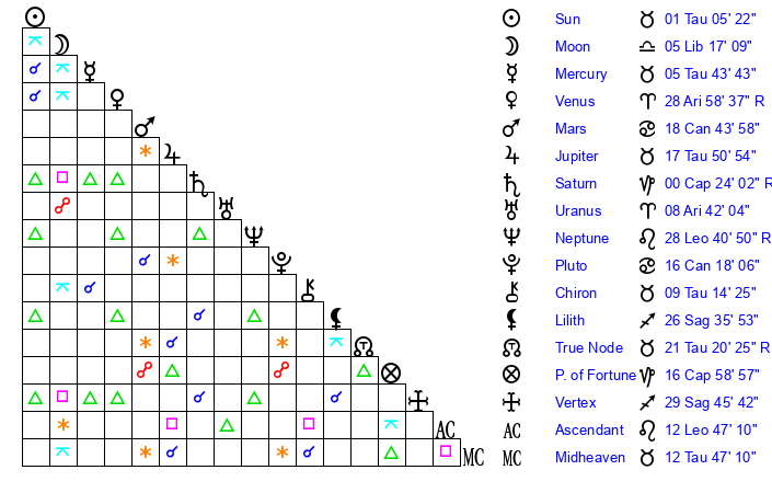 | Sun | 1 Taurus 6 | 1 Taurus 50 | 3 Leo 11 |