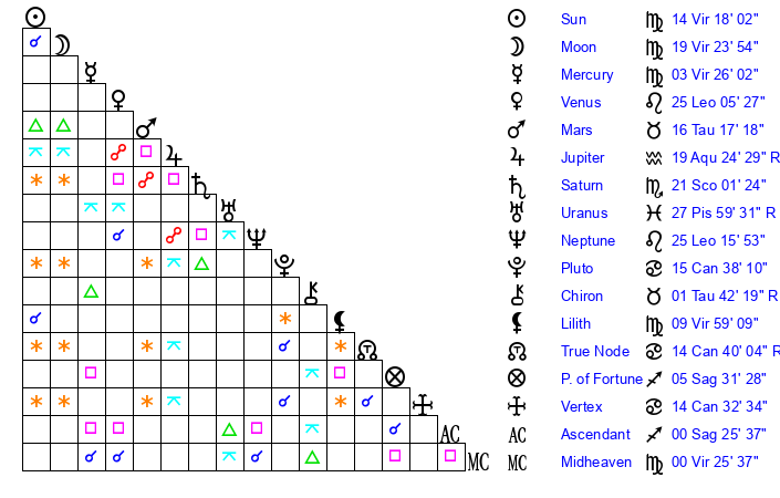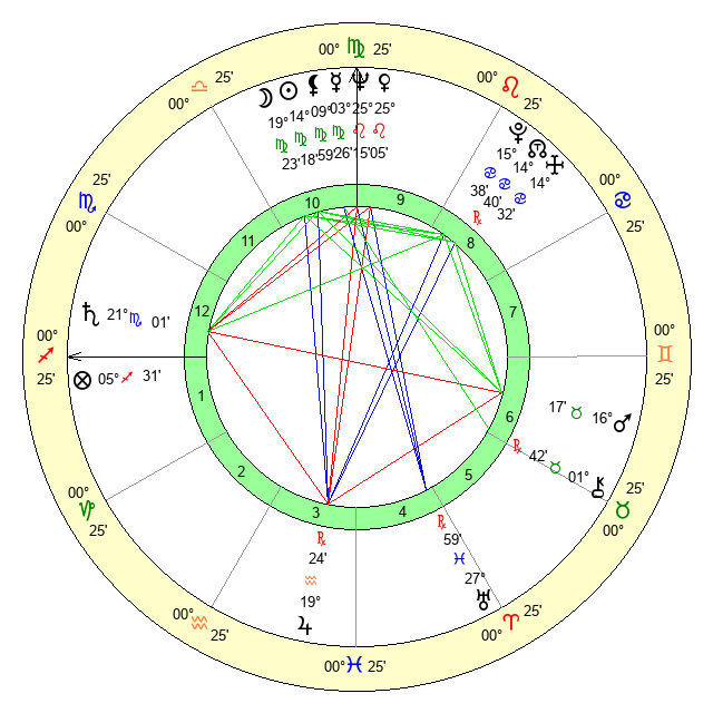 | Moon | 19 Virgo 27 | 14 Pisces 39 | 8 Taurus 2 |