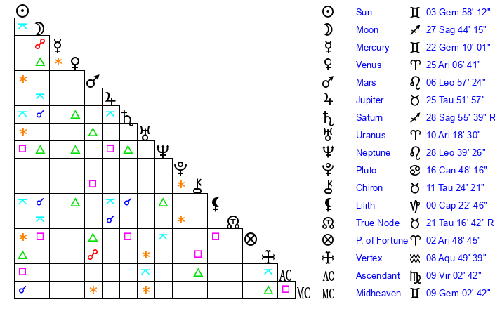 | Sun | 3 Gemini 58 | 4 Gemini 44 | 5 Virgo 51 |