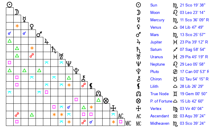| Neptune | 29 Leo 6 | 29 Pisces 32 | 27 Leo 43 |