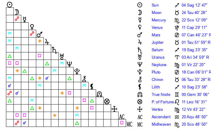 | Moon | 24 Taurus 40 | 15 Aquarius 58 | 15 Sagittarius 8 |
