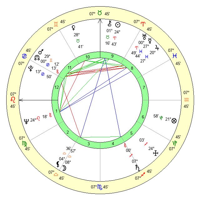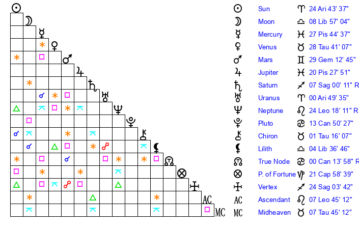 | Moon | 8 Libra 55 | 25 Scorpio 10 | 13 Taurus 12 |