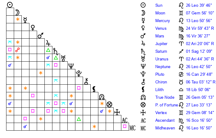 | Neptune | 26 Leo 43 | 1 Aries 37 | 29 Leo 11 |