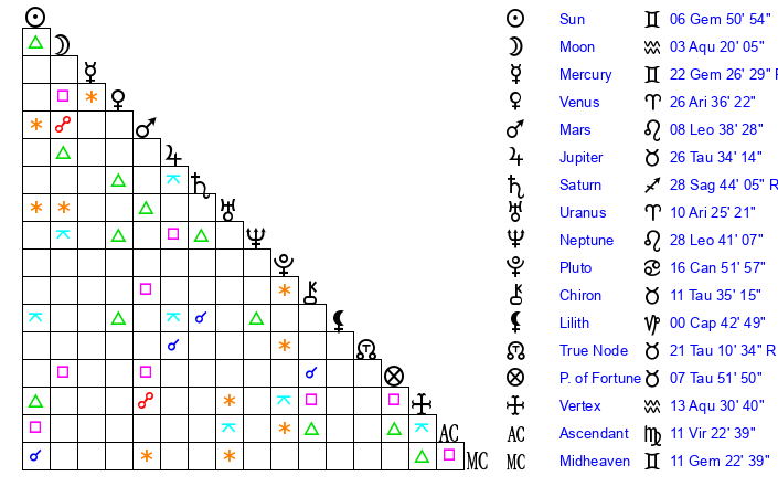 | Moon | 3 Aquarius 13 | 29 Gemini 42 | 14 Leo 25 |