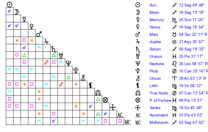 | Saturn | 0 Sagittarius 45 | 25 Pisces 7 | 8 Sagittarius 5 |