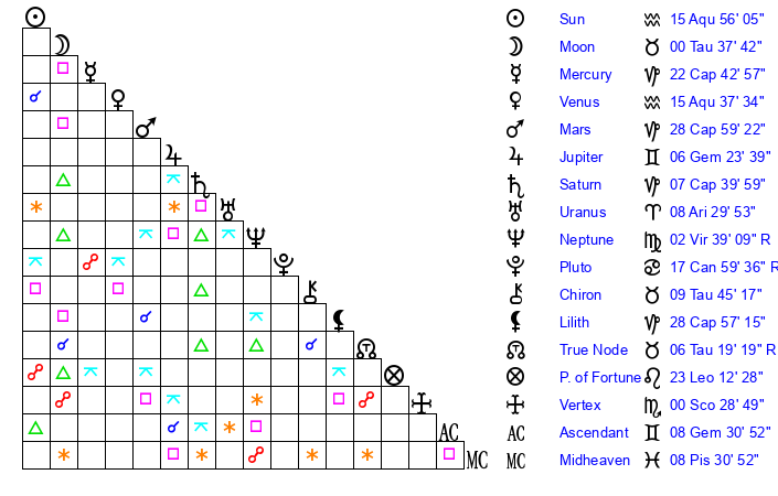 | Sun | 15 Aquarius 56 | 16 Aquarius 53 | 20 Taurus 1 |
