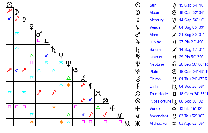 | Pluto | 16 Cancer 5 | 2 Aquarius 55 | 15 Cancer 3 |
