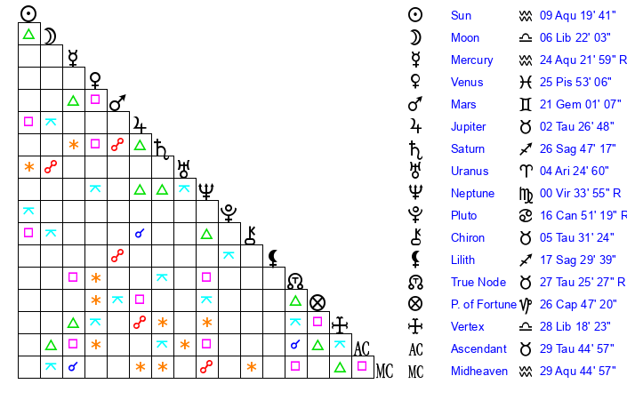 | Moon | 6 Libra 22 | 12 Aquarius 20 | 27 Pisces 42 |