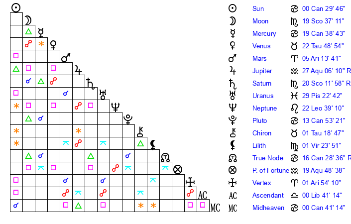 | Pluto | 13 Cancer 54 | 3 Aquarius 18 | 15 Cancer 53 |