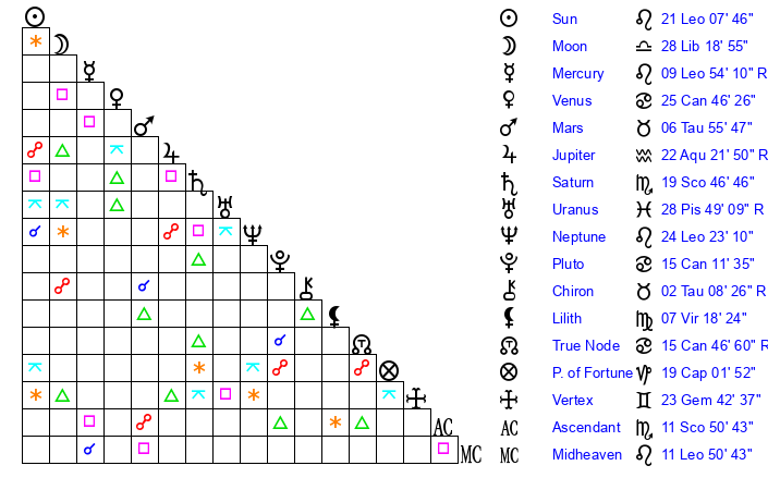 | Mercury | 9 Leo 53 | 4 Leo 55 | 8 Sagittarius 19 |