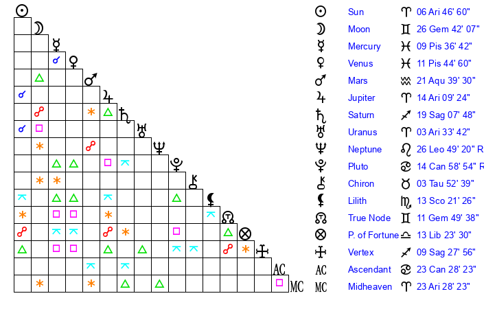 | Pluto | 14 Cancer 59 | 3 Aquarius 28 | 16 Cancer 31 |