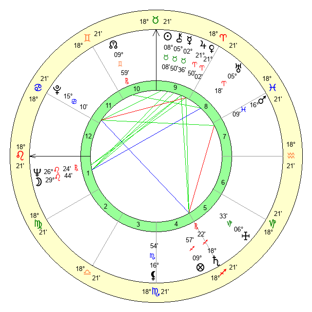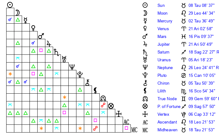 | Moon | 29 Leo 48 | 21 Taurus 28 | 6 Pisces 25 |
