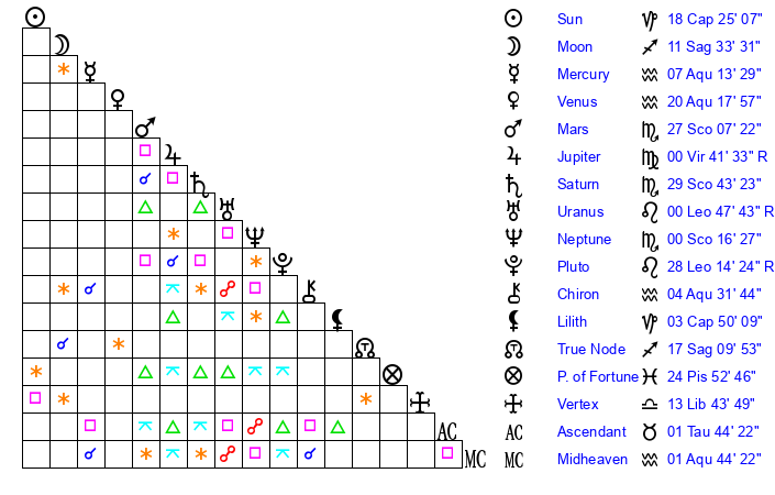| Venus | 20 Aquarius 18 | 20 Capricorn 10 | 13 Taurus 17 |