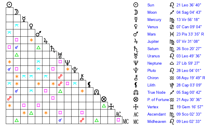 | Neptune | 27 Libra 59 | 1 Aries 44 | 0 Scorpio 7 |