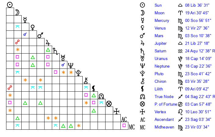 | Moon | 19 Aries 34 | 29 Capricorn 31 | 16 Gemini 47 |