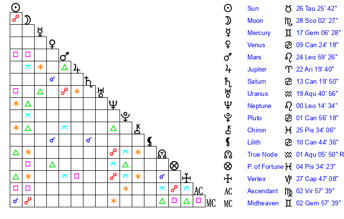 | Sun | 26 Taurus 25 | 27 Taurus 2 | 10 Virgo 49 |