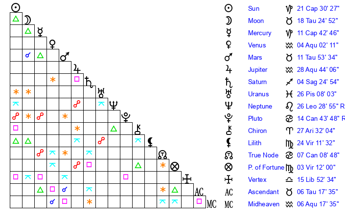 | Moon | 18 Taurus 28 | 14 Scorpio 50 | 21 Sagittarius 47 |