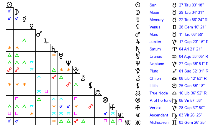 | Moon | 29 Taurus 25 | 23 Capricorn 20 | 20 Gemini 41 |