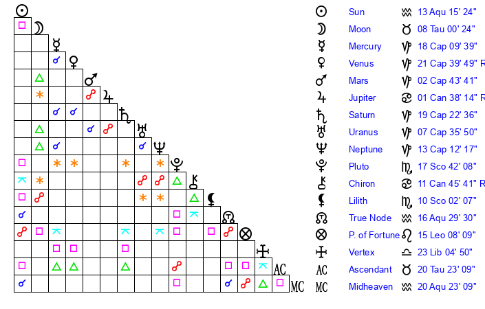| Neptune | 13 Capricorn 12 | 28 Pisces 0 | 14 Capricorn 10 |