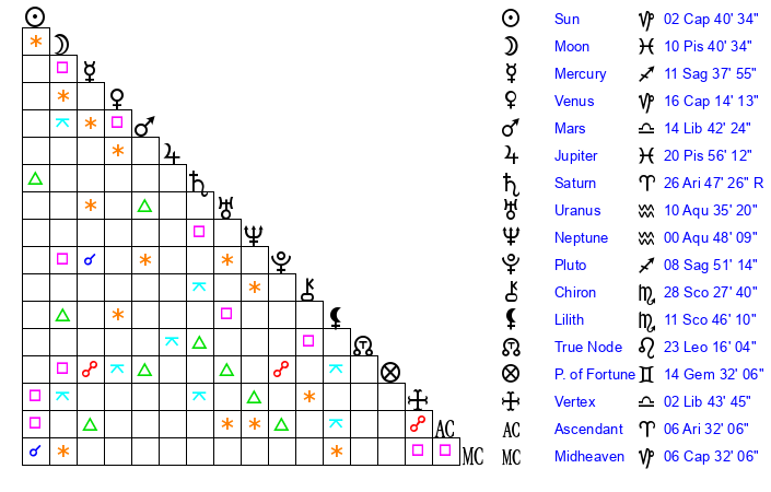 | Neptune | 0 Aquarius 47 | 27 Pisces 12 | 1 Aquarius 45 |