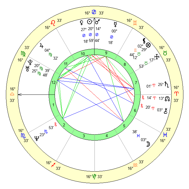 | Sun | 21 Cancer 0 | 21 Cancer 13 | 15 Virgo 45 |