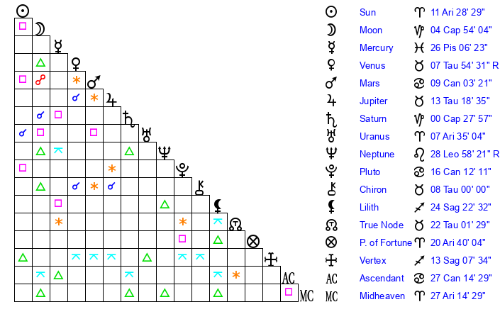 | Moon | 4 Capricorn 42 | 27 Taurus 52 | 11 Cancer 52 |