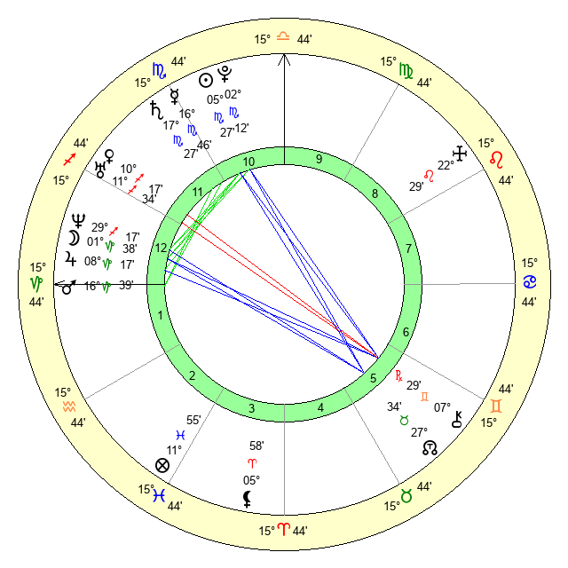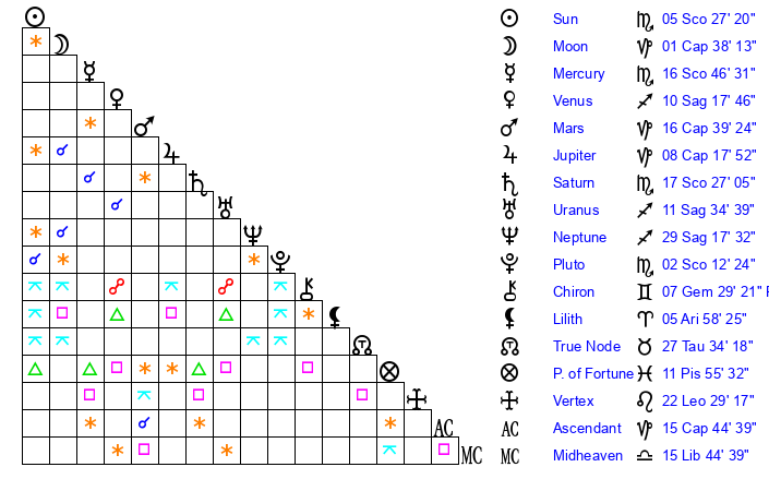 | Saturn | 17 Scorpio 44 | 25 Pisces 51 | 22 Scorpio 34 |
