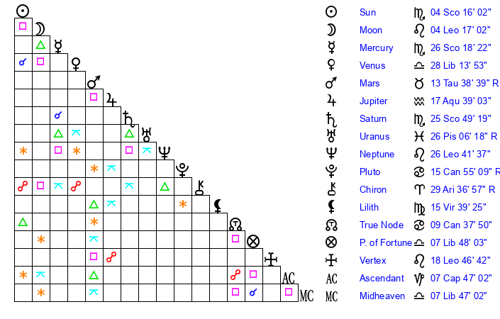 | Mercury | 26 Scorpio 19 | 28 Scorpio 57 | 19 Aquarius 42 |