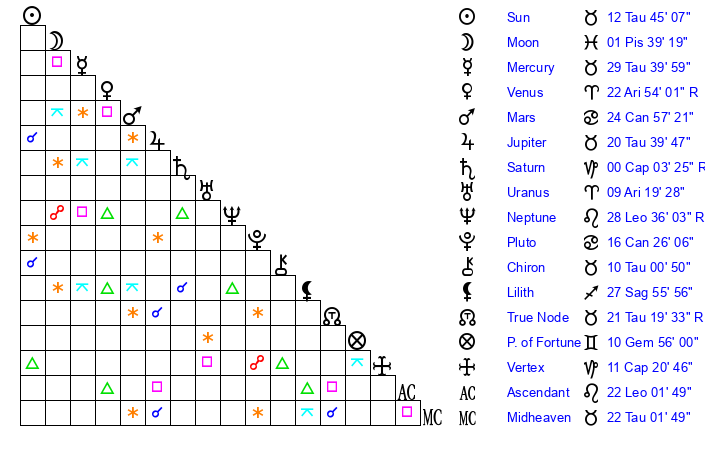 | Venus | 22 Aries 55 | 1 Aries 45 | 2 Cancer 46 |