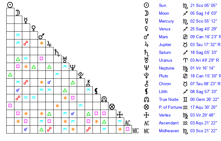 | Sun | 21 Scorpio 5 | 21 Scorpio 34 | 29 Aquarius 35 |