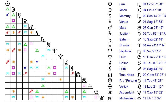 | Sun | 1 Scorpio 3 | 1 Scorpio 32 | 9 Aquarius 20 |