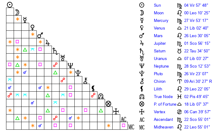 | Moon | 0 Leo 10 | 7 Scorpio 46 | 5 Leo 30 |