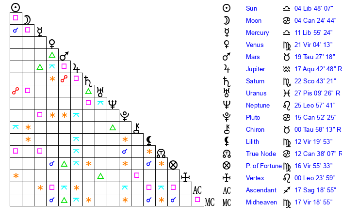 | Mercury | 11 Libra 56 | 17 Libra 30 | 0 Capricorn 57 |