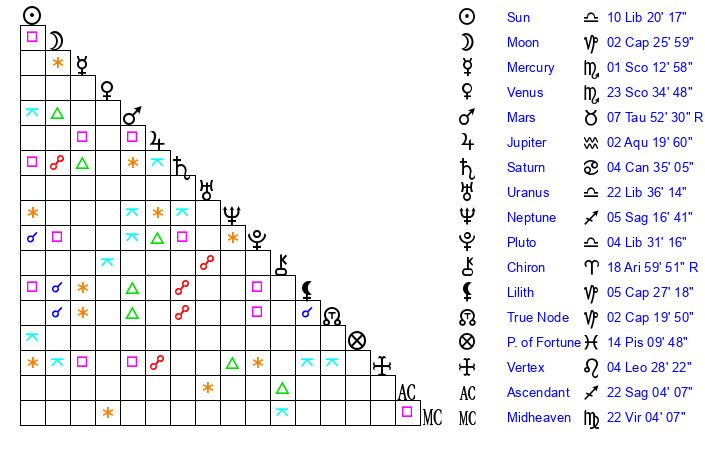 | Venus | 23 Scorpio 34 | 17 Virgo 24 | 18 Capricorn 53 |