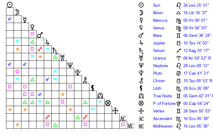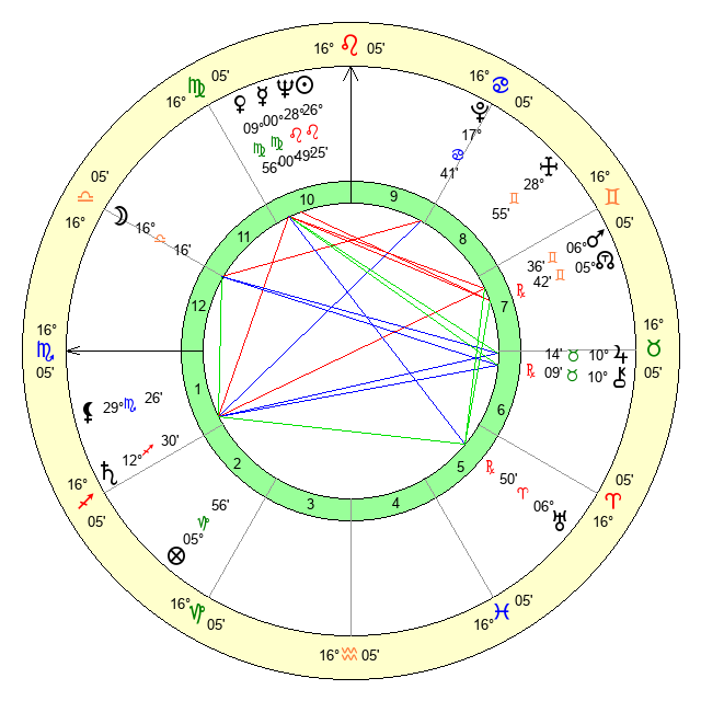 | Moon | 16 Libra 24 | 12 Cancer 33 | 24 Aries 51 |