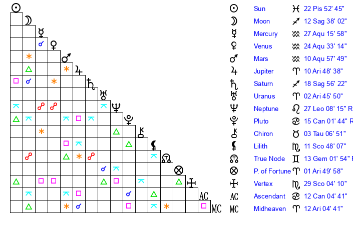 | Sun | 22 Pisces 53 | 23 Pisces 22 | 27 Gemini 10 |