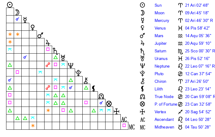 | Moon | 9 Aries 51 | 7 Libra 43 | 14 Scorpio 33 |