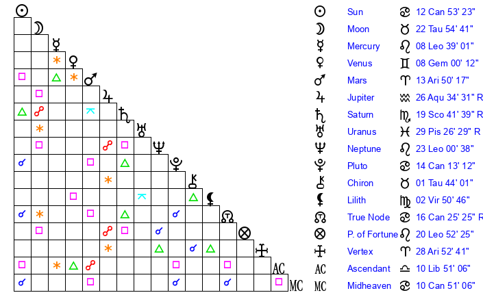| Moon | 22 Taurus 49 | 15 Scorpio 30 | 25 Sagittarius 12 |