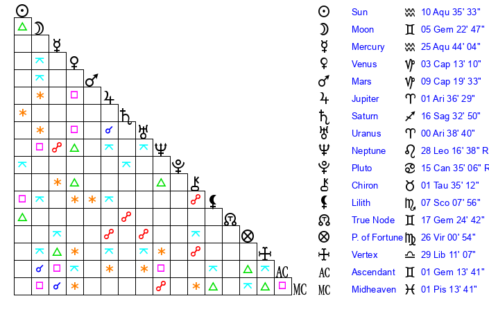 | Sun | 10 Aquarius 36 | 12 Aquarius 4 | 16 Taurus 52 |
