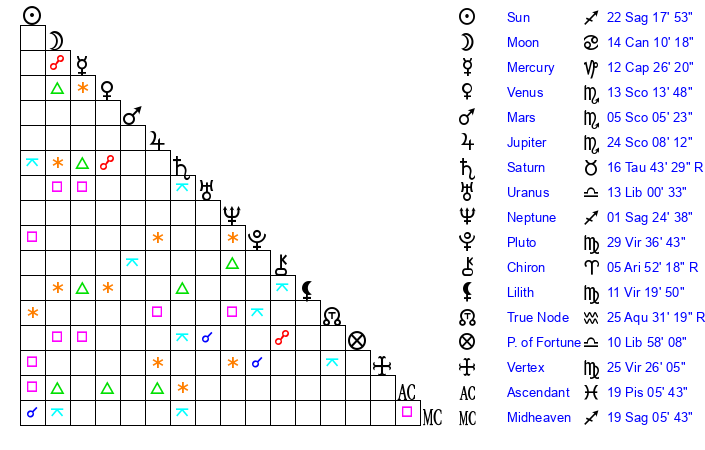 | Sun | 22 Sagittarius 18 | 22 Sagittarius 57 | 18 Aquarius 16 |