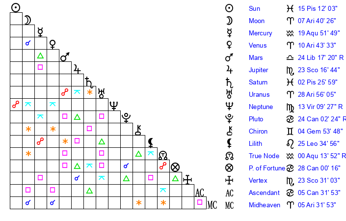 | Sun | 15 Pisces 12 | 16 Pisces 22 | 13 Gemini 8 |