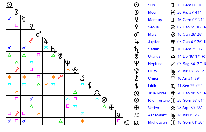 | Moon | 25 Pisces 32 | 13 Libra 34 | 5 Pisces 25 |