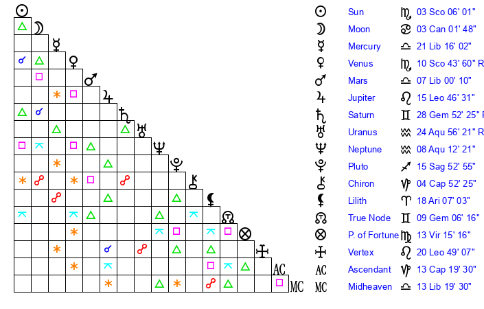 | Sun | 3 Scorpio 6 | 3 Scorpio 32 | 26 Scorpio 11 |