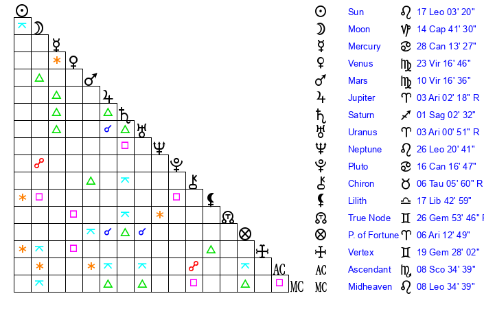 | Moon | 14 Capricorn 43 | 5 Pisces 50 | 28 Leo 53 |