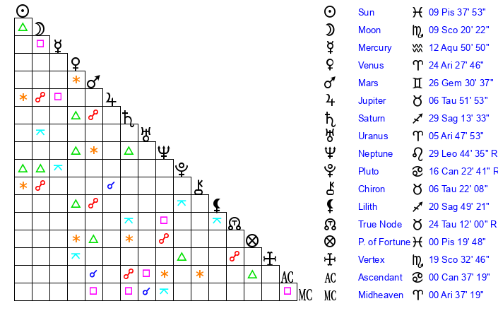 | Sun | 9 Pisces 38 | 10 Pisces 21 | 13 Gemini 34 |